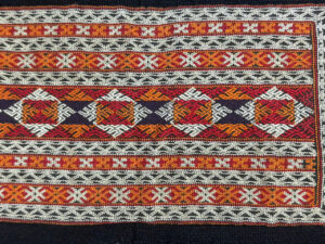 Đường diềm mầu trắng hình tam giác biểu tượng núi cao trùng điệp, sự kết hợp hài hòa giữa các họa tiết gựi lên sự cân bằng giữa thiên nhiên khắc nghiệt và sự mềm mại của người phụ nữ. Nhìn lại bức tranh tổng thể cả mảng thêu dưới ống quần của người phụ nữ Dao đỏ cho thấy các hoa văn thêu không chỉ để trang trí mà còn thể hiện quan niệm vũ trụ, sự sống, tôn vinh vẻ đẹp nữ tính và khéo léo, những đường nét tỉ mỉ mang theo câu chuyện văn hóa sâu sắc, được lưu truyền qua nhiều thế hệ.
