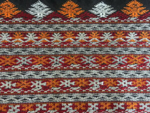 Các hoa văn trên tấm thêu lưng áo của người Dao đỏ mà cả nam và nữ đều có là một mảng trang trí mang tính biểu tượng mạnh mẽ, thể hiện sự mong cầu may mắn và kết nối với tổ tiên với ba mầu chủ đạo là đỏ - vàng – trắng tượng trưng cho lửa – mặt trời – vũ trụ theo tư duy hình học của người Dao đỏ. Nhìn trên tấm thêu nổi bật là họa tiết hình học xen kẽ (hàng giữa) đây là họa tiết nổi bật nhất, gồm các khối hình thoi liên kết thành chuỗi, các hình thoi lồng vào nhau tượng trưng cho sự cân bằng âm – dương, sự hài hòa trong cuộc sống. Mỗi hình thoi được chia ô đỏ, vàng, trắng, đen thể hiện ý: đỏ tượng trưng cho lửa, sức mạnh, sự sống, mầu vàng tượng trưng cho mùa màng thịnh vượng, mầu trắng tượng trưng cho sự trong sạch, thuần khiết, mầu đen là đất mẹ trong truyền thuyết con người được sinh ra từ đất. Mảng thêu được đặt ở phần lưng được xem như “ Trục năng lượng” giữa phần lưng – vị trí dễ bị “ gió độc” theo quan niệm dân gian, có ý nghĩa luôn được bảo vệ. Họa tiết sóng, mây uốn lượn mầu chỉ trắng xuất hiện xen giữa các dải hoa văn mang ý nghĩa mây - nước biểu trưng của sự mềm mại, nữ tính, mang ý niệm dòng chảy cuộc sống, sự tuần hòa và bền vững, là lời chúc cho người con gái luôn có cuộc sống êm đềm, hòa thuận. Họa tiết chữ X, hoa sao tám cánh mầu trắng trên nền đỏ - cam tượng trưng cho ánh sáng và sinh khí, xua đuổi cái xấu, “ sao tám cánh ” là mô típ phổ biến tượng trưng cho bốn phương – tám hướng, biểu thị sự kết nối giữa con người và vũ trụ. Khung viền trắng bao quanh toàn bộ tấm thêu được làm dạng móc nối, mắt lưới là “ đường biên bảo hộ” giữ gìn năng lượng tốt bên trong tấm thêu, mắt lưới còn thể hiện sự kết nối cộng đồng, đoàn kết của người Dao đỏ, cũng tượng trưng cho sự khéo léo và tài thêu của phụ nữ Dao đỏ, sự phối hợp mầu tổng thể đỏ - trắng – vàng – đen không chỉ để đẹp mà còn mang tính tâm linh và biểu tượng thể hiện vòng đời đất – nước – lửa – ánh sáng.